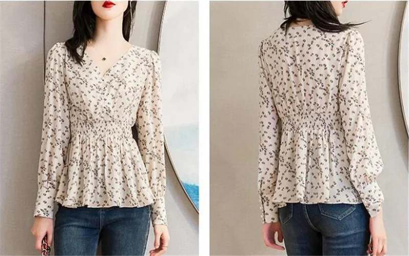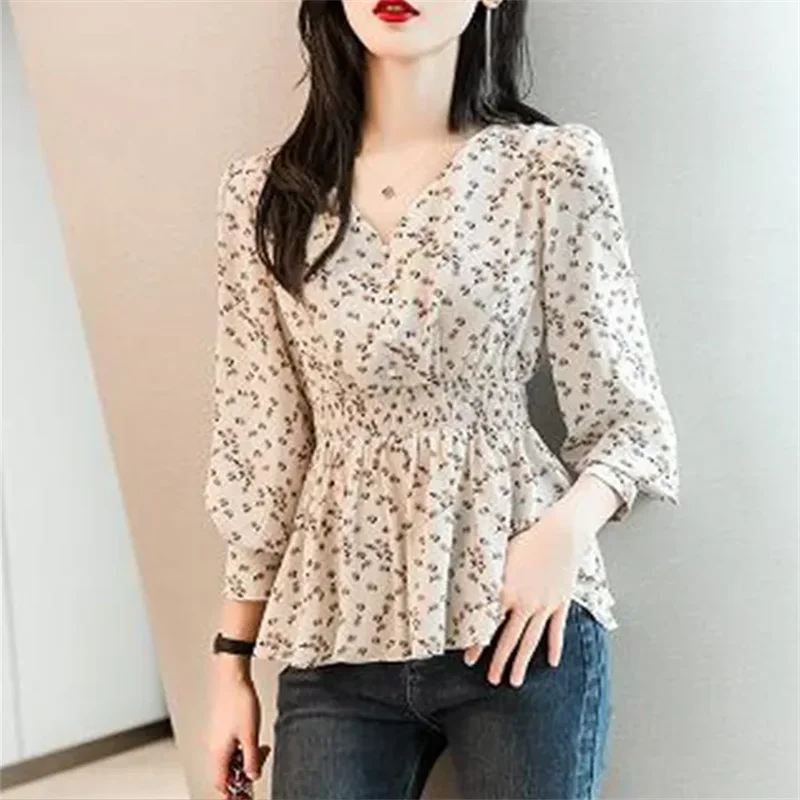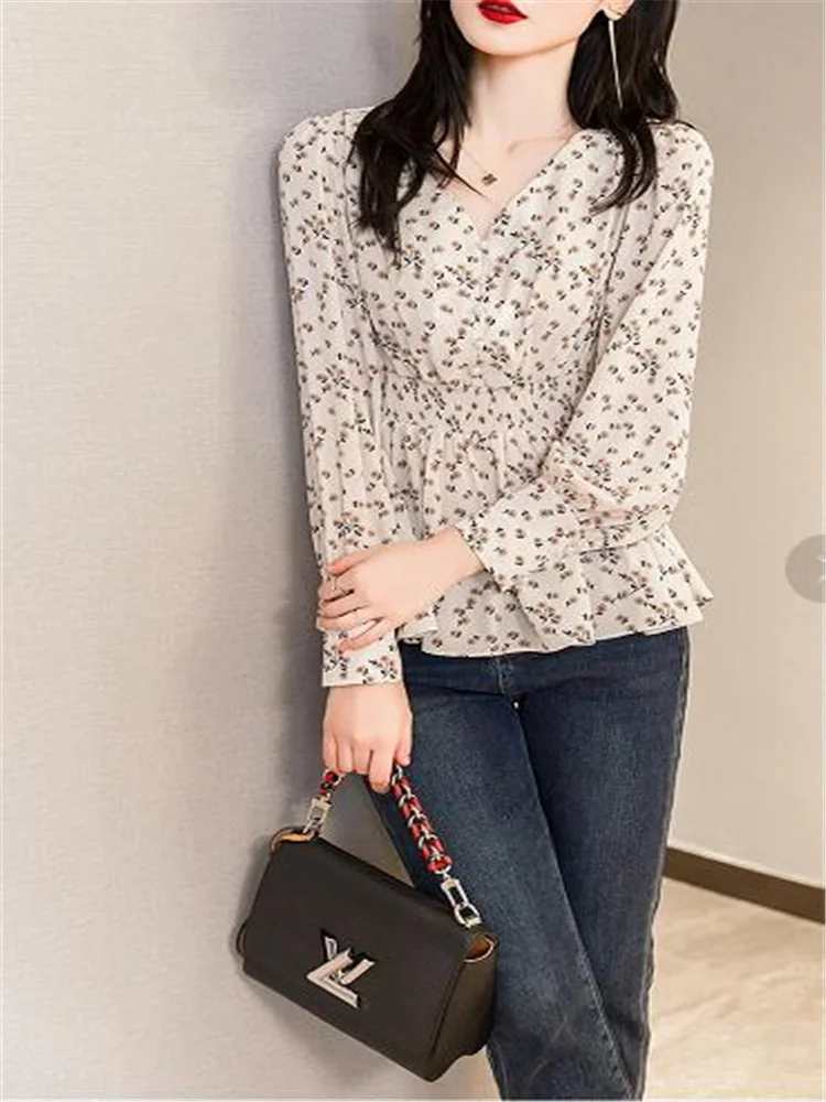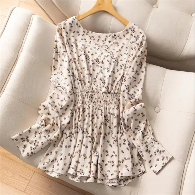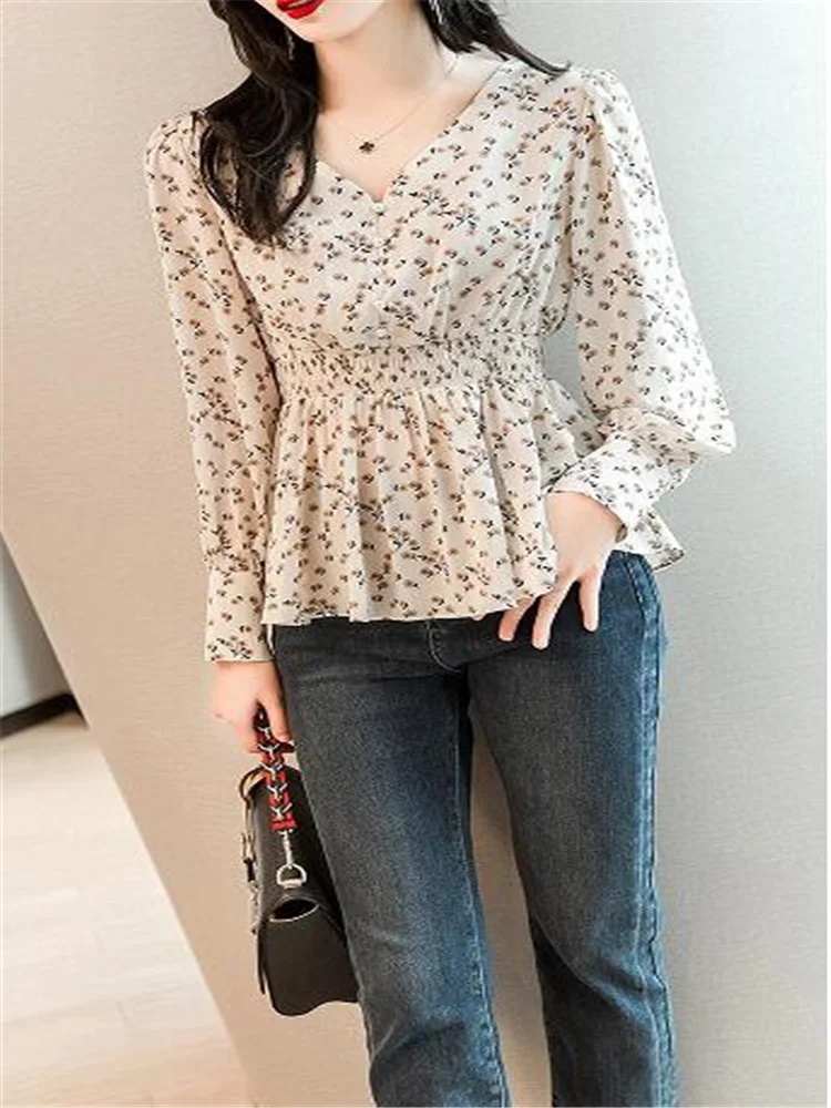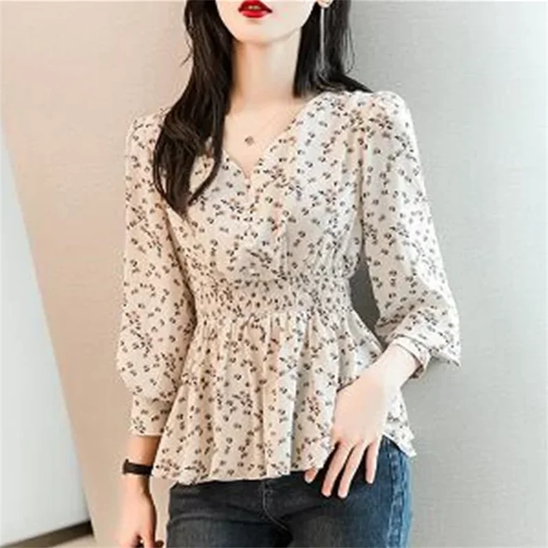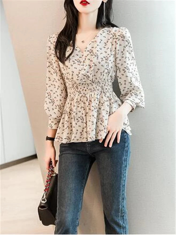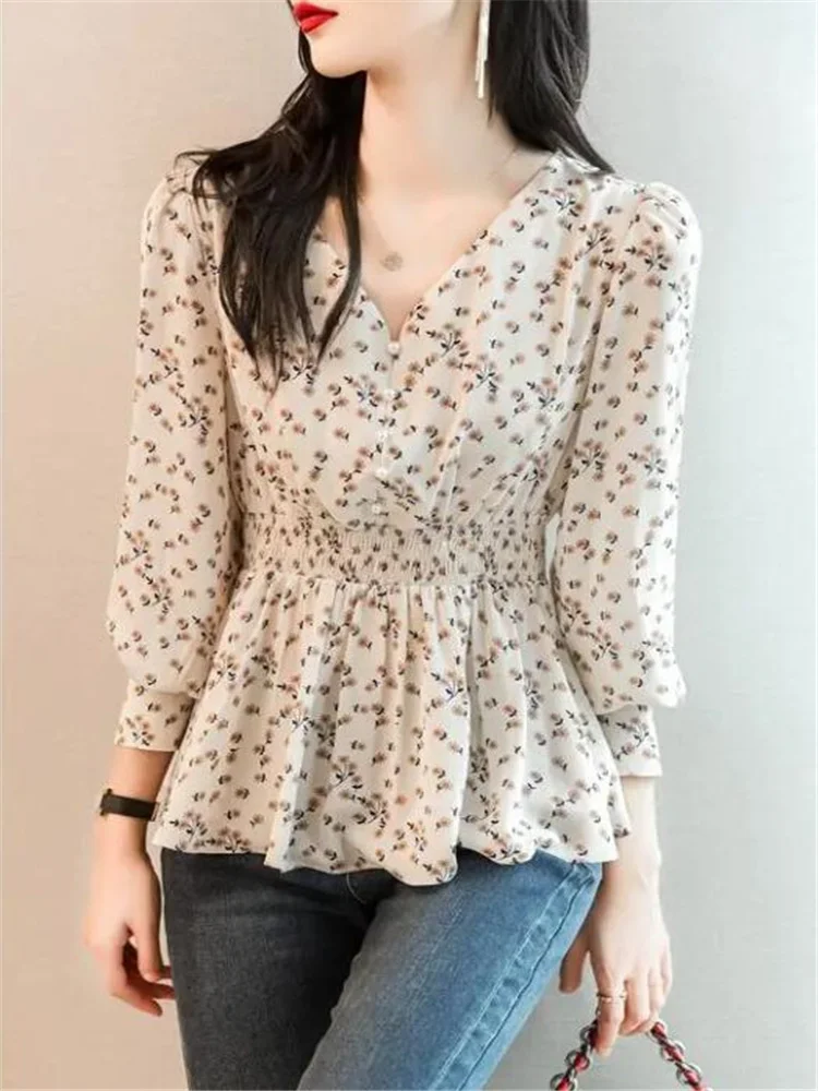Pearl Button V-neck Shirt Women Retro Floral Shirt  Tunic Lantern Sleeve Blouses Women Elegant Pullover Soft Casual Retro Shirt