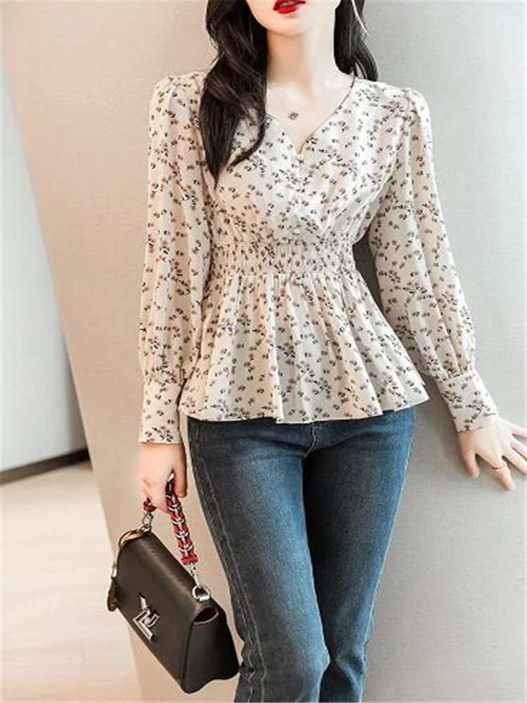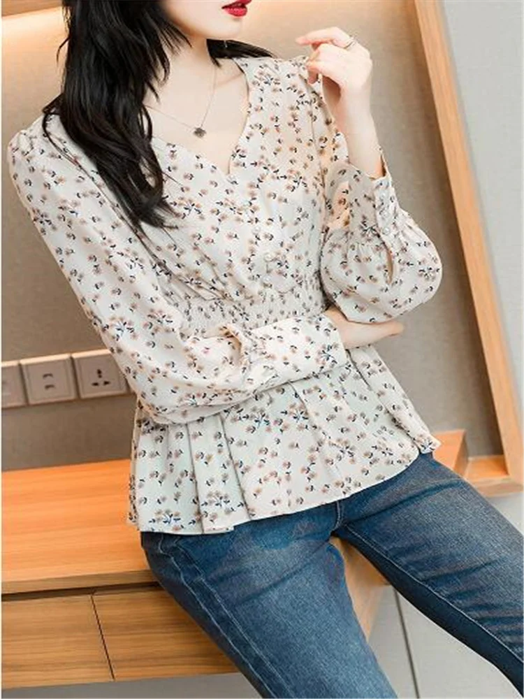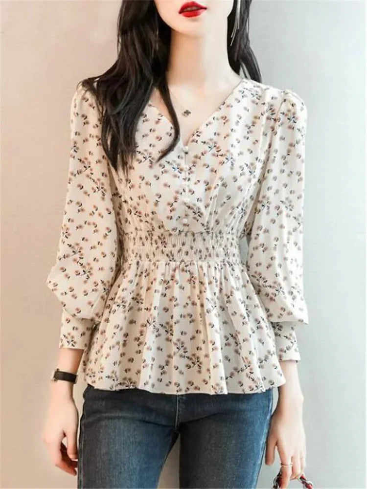 Pearl Button V-neck Shirt Women Retro Floral Shirt Tunic Lantern Sleeve Blouses Women Elegant Pullover Soft Casual Retro Shirt