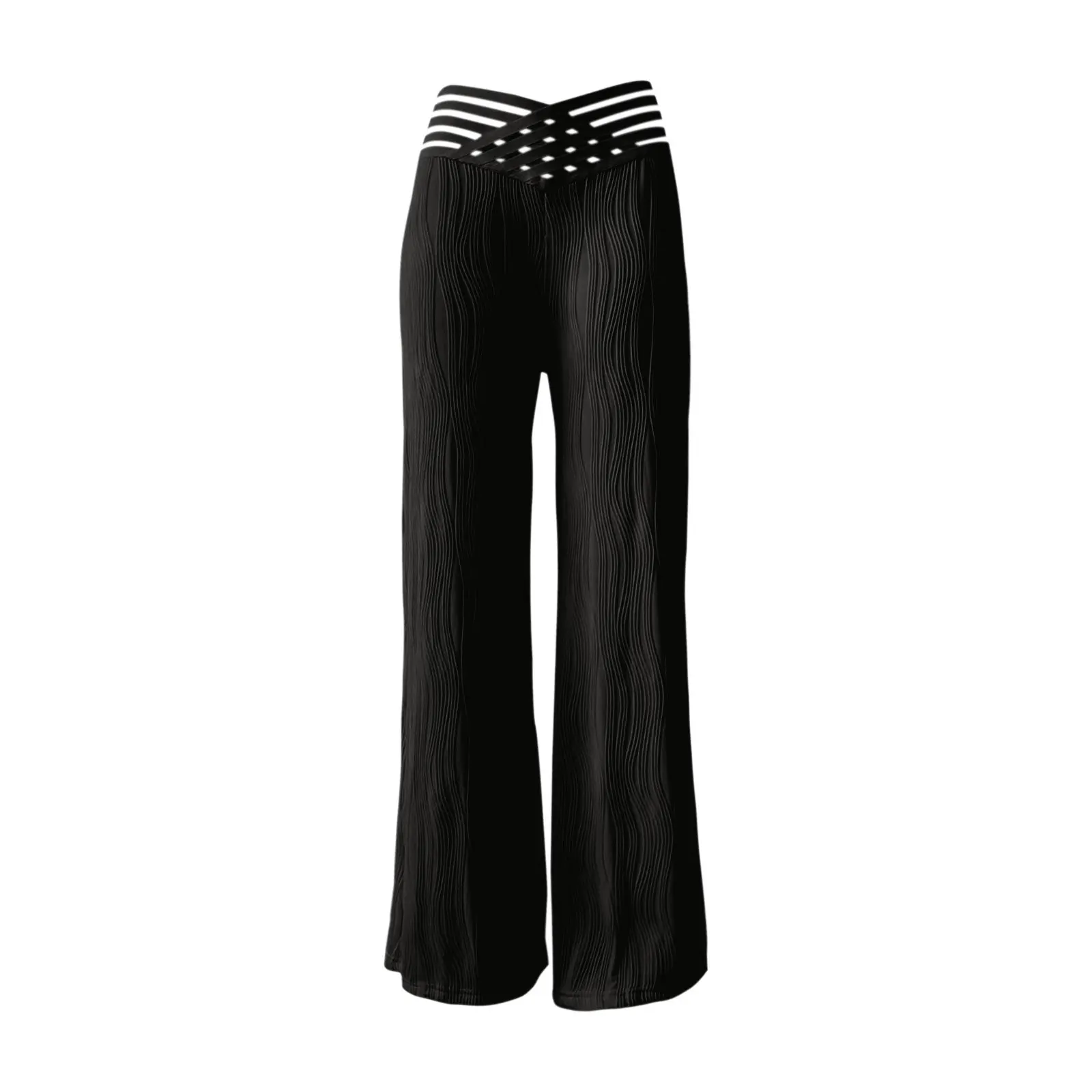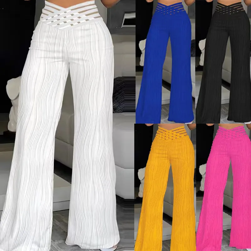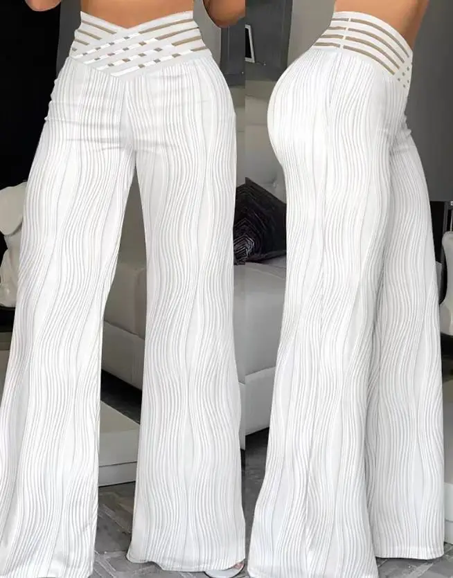 Elegant High Waist Flared Pants For Women Overlap Waisted Textured Criss Cross Sheer Mesh Design Female Summer Work Trousers